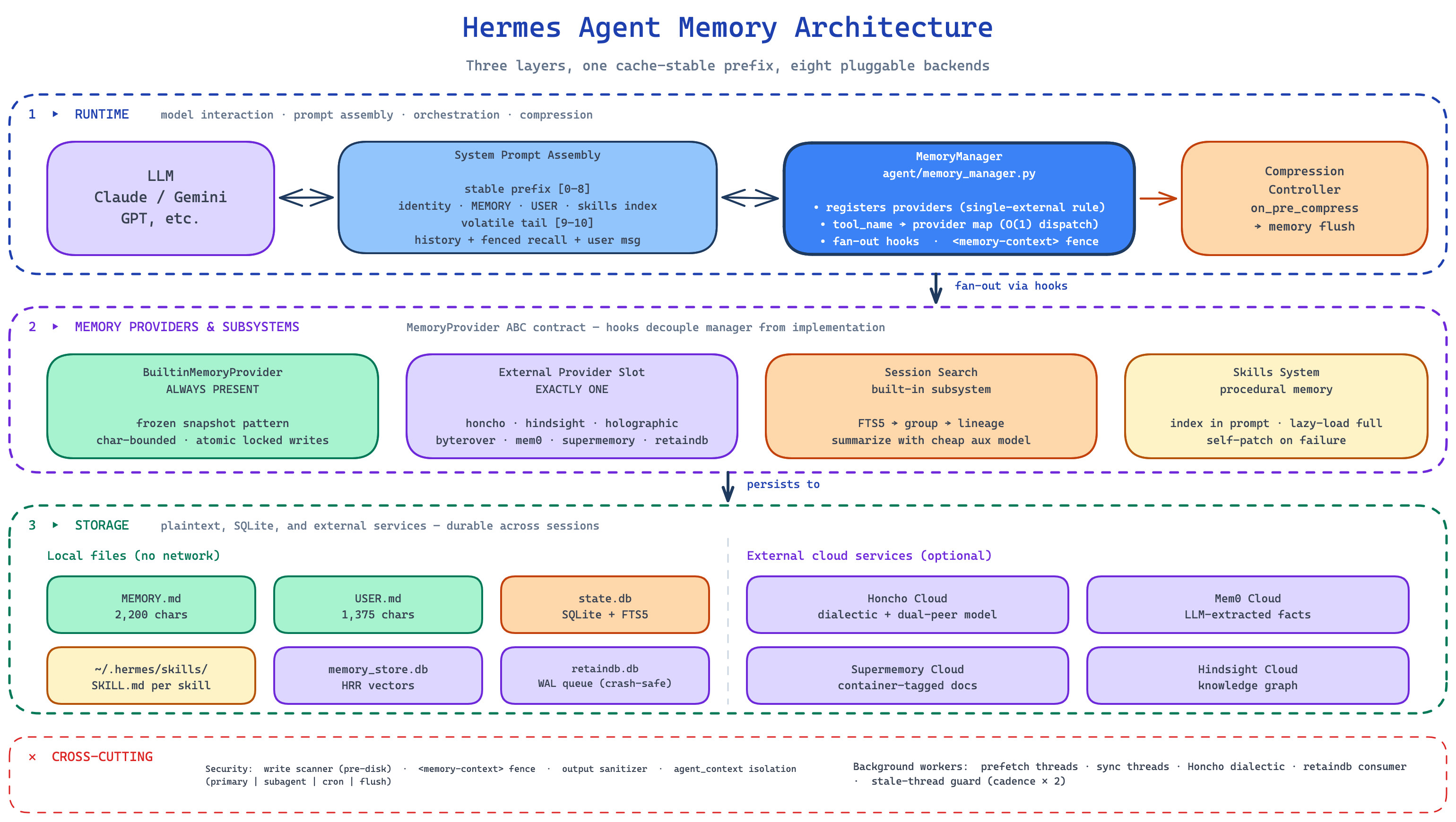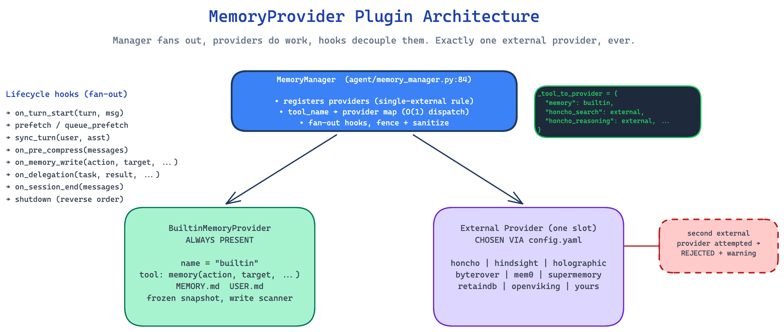 The internal architecture doc describes Hermes as a two-layer stacked memory system. There is a built-in curated layer (MEMORY.md, USER.md) and exactly one external provider chosen via config (honcho, holographic, retaindb, and so on). That is the plugin author’s view.