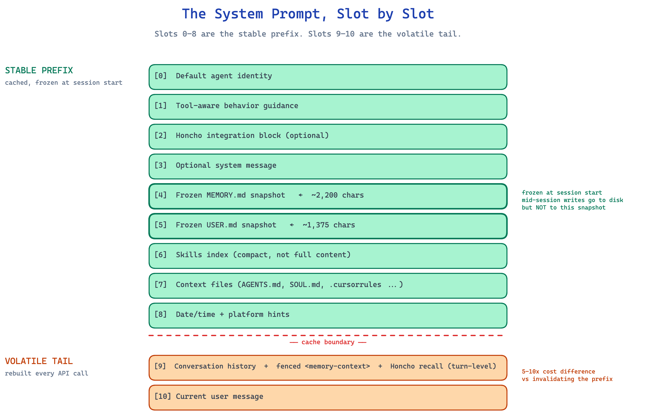 Slots 0 through 8 are the stable prefix. Slots 9 and 10 are the volatile tail.