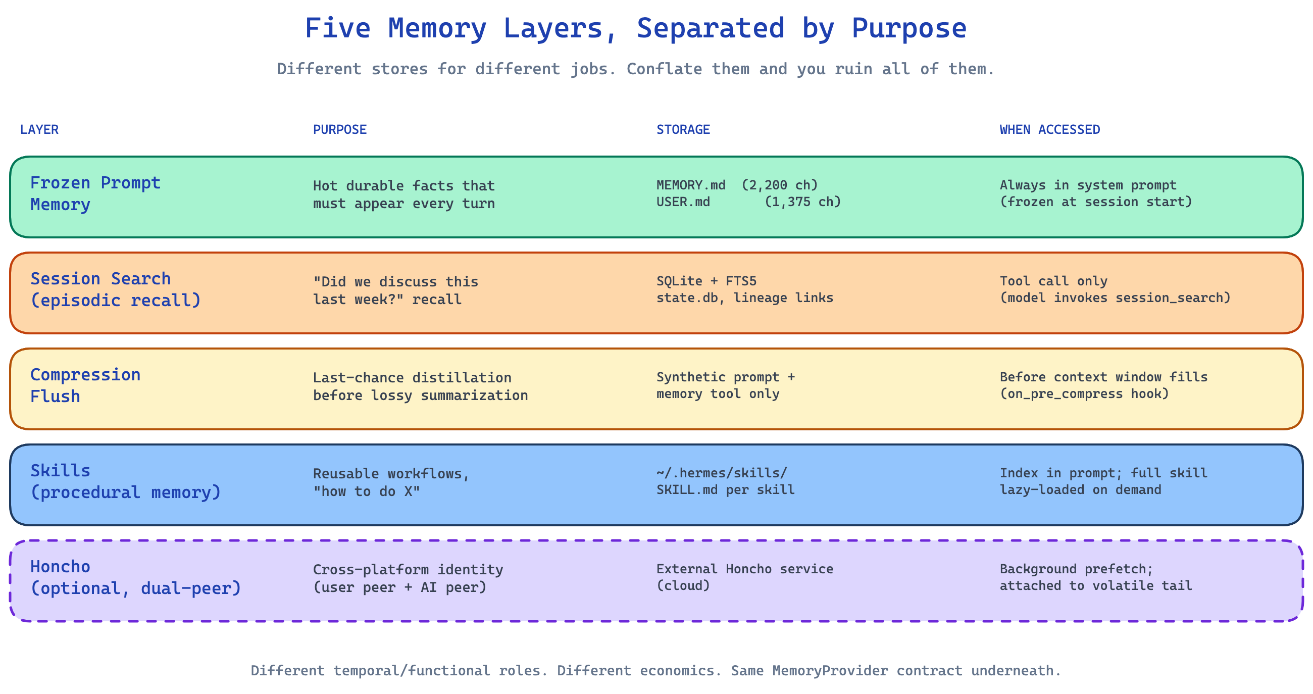It separates hot memory from cold recall. The single most important architectural call. Tiny prompt memory for what always matters. SQLite + FTS5 for what only sometimes matters. Skills for what you need to do. Honcho for who you are. Conflating these into one store is what ruins most agent memory systems.
