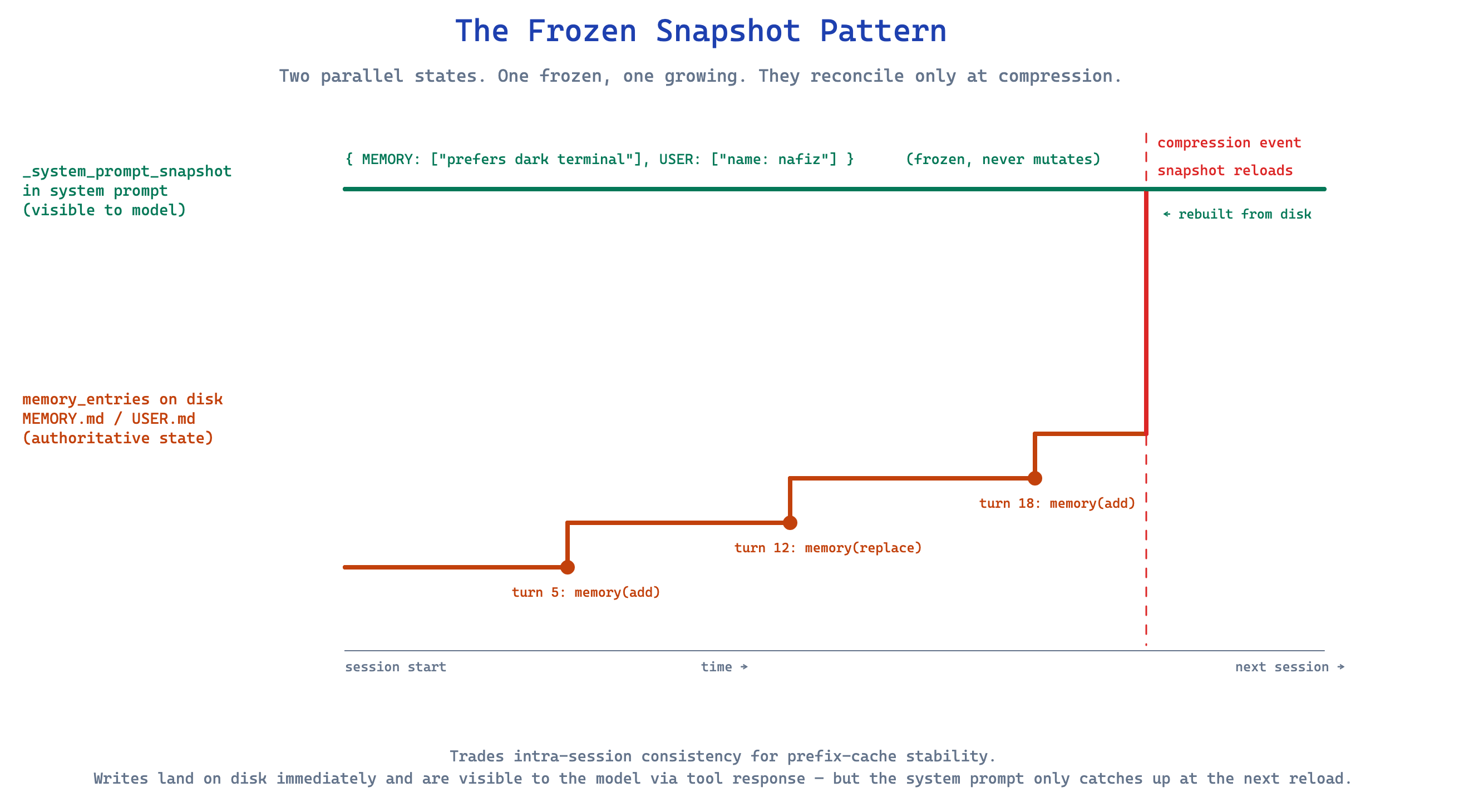 This trades intra-session consistency for prefix-cache stability. It is a real trade. If the user tells you their name in turn 3 and you save it to USER.md, the system prompt in turn 4 still doesn’t show that name. The model will know it from the tool response, and from conversation history, but it won’t be in the cached prefix until the next session boots.