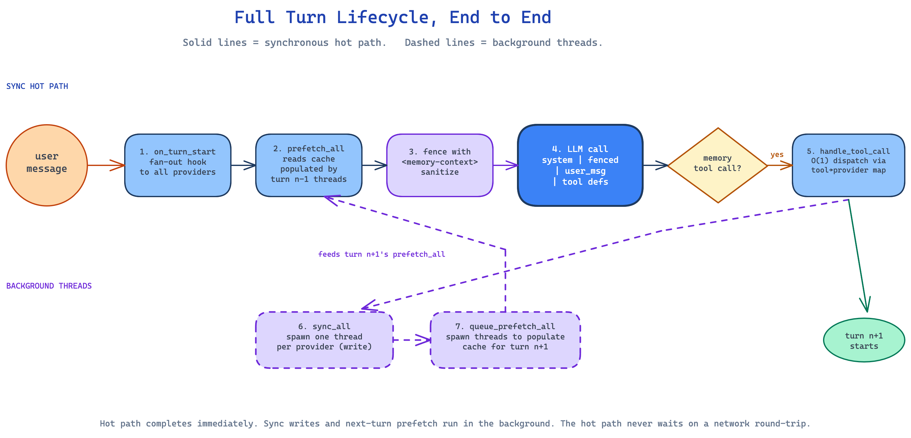 Steps 6 and 7 are non-blocking. The agent can advance to turn n+1 immediately. The slow work happens in the background, and turn n+1 will read the cache those threads populated.