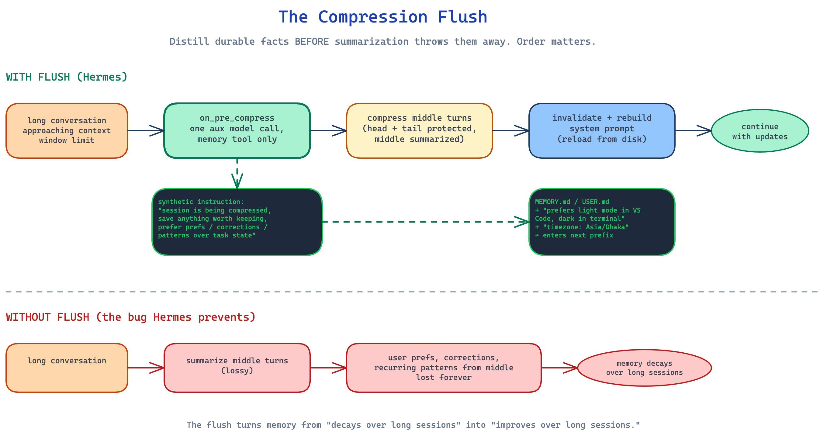 | Compression flush | Last-chance distillation before lossy summary | Synthetic prompt + memory tool only |